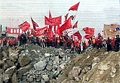 圖:截流成功現場工程人員在圍堰上揮舞紅旗慶賀