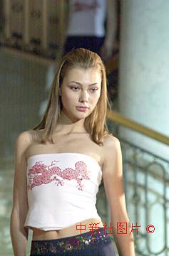一名到北京參加大都會世界超級模特大賽的俄羅斯少女,日前晚會上身著龍紋胸圍向新聞界亮相。中新社記者 賈國榮 攝
