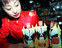 北京老舍茶館的服務小姐正在向戲迷推銷一種包裝獨特的“戲酒”。這種繪有京劇臉譜的瓶裝酒,在元旦節前一上市就受到戲迷們的青睞。中新社記者 張勤 攝
