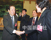 國務院副總理錢其琛八日在北京人民大會堂臺灣廳,向出席全國政協大會的臺灣婦女代表祝賀節日。中新社記者 宋吉河 攝
