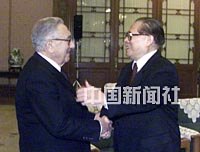 國家主席江澤民二十日在北京人民大會堂會見美國前國務卿基辛格。中新社記者 李剛 攝