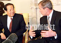 美東時間二十二日,中國國務院副總理錢其琛與美國總統布什在白宮會晤。會晤前,他們共同會見了記者。中新社圖 胡啟華 攝