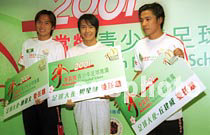影星周星馳、本地甲組足球員丘健威(右)、陳豪文(左)8日在香港出席“2001麥當勞青少年足球推廣”記者會,獲邀出任足球大使,協助青少年足球推廣活動。中新社傳真 鄧慶樂 攝