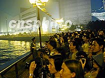 五月八日晚在香港舉行的祝賀“2001年《財(cái)富》論壇”煙花匯演上,無數(shù)市民爭相涌上街頭一睹絢麗多彩的煙花。中新社圖 洪少葵 攝