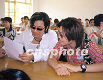 “星火行動”之粵北科教新紀元扶貧助學系列活動,五月十四日至十六日在韶關市拉開序幕。“星火愛心大使”王杰、容祖兒來到始興縣澄江中學,與學生一起上物理課。中新社圖 馮昶 攝