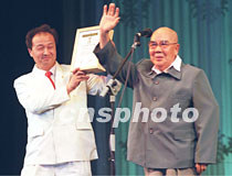 86歲高齡的京劇表演藝術家袁世海日前在北京人民劇場登臺演出京劇《紅燈記》,創下登臺演出年齡最大的吉尼斯紀錄。圖為有關人員向袁先生頒發吉尼斯紀錄證書。中新社圖 史利 攝