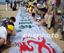 “華夏故土地圖”推廣、海南取土儀式二日在三亞南山舉行。在現場還進行了 一場聲勢浩大的“支持北京申奧簽名活動”。中新社圖 王辛莉 攝