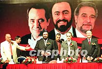圖:三大男高音演唱會新聞發布會 2001年06月21日 18:46 ![]() 世界三大男高音北京紫禁城演唱會新聞發布會21日在北京舉行,先期到達北京的帕瓦羅蒂、卡雷拉斯和三大男高音的經濟人魯道斯等出席并回答了中外記者的提問。中新社記者 李剛 攝