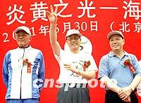組圖:"北京奧運·炎黃之光—海峽兩岸長跑活動"抵京 2001年06月30日 17:46 ![]() “北京奧運·炎黃之光——海峽兩岸長跑活動”30日在北京舉行,臺灣代表團團長楊傳廣(左)、中國奧林匹克委員會副主席張發強(右)與北京市奧申委常務副主席劉敬民出席,并祝北京申奧成功。中新社記者 趙振清 攝 ![]() “北京奧運·炎黃之光--海峽兩岸長跑活動”6月16日從臺北出發,經高雄、深圳、寧波、杭州、上海、無錫、南京、青島八個站區30日抵京。來自海峽兩岸的名人與首都3000多名各界代表會聚一堂,進行了申奧長跑活動,祝北京申奧成功。中新社記者 趙振清 攝