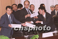 圖文快訊:中日就貿易磨擦問題展開正式磋商 2001年07月03日 14:05 ![]() 中日雙方政府有關部門七月三日下午在北京對外經貿部,就日方對三種農產品臨時保障措施和中方的特別關稅措施問題,開始舉行正式磋商。中新社記者 鄒憲 攝 ![]() 中國外經貿部談判代表團團長郭莉七月三日下午在北京的外經貿部大樓與日本代表團就中日貿易摩擦問題展開正式磋商。中新社記者 鄒憲 攝