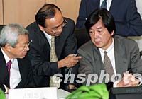 日方代表團團長田中均(右)七月三日在北京就中日貿易磨擦問題與中方進行正式磋商。圖為田中均與佐野忠克等人談判前交換意見。中新社記者 鄒憲 攝