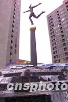 7月10日,在莫斯科世貿中心酒店前的階梯噴泉開始噴水,迎接將于12日召開的國際奧委會112次會議。中新社記者 王瑤 攝