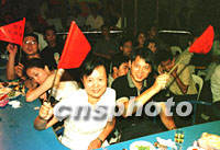 福州市眾多百姓十三晚走出家門來到酒吧、咖啡屋等公眾場所,通過觀看電視、收聽收音機等方式關注北京申奧進展。中新社圖 劉可耕 攝