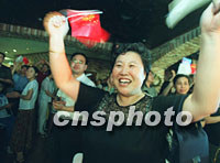 13日夜,一位體態豐滿的北京市民為申奧成功高呼。中新社記者 宋吉河 攝