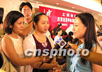 在悉尼奧運會上為中國獲得第一枚金牌的射擊運動員陶璐娜(右),七月十三日晚上對記者說,她有信心參加北京奧運會的比賽。中新社記者 潘索菲 攝
