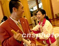 中國著名導(dǎo)演張藝謀與奧運(yùn)會(huì)冠軍劉璇,在中國駐莫斯科大使館互相祝賀北京申辦奧運(yùn)會(huì)成功。中新社記者 賈國榮 攝