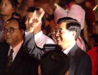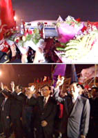 組圖:北京申奧代表團7月14日晚載譽歸來 2001年07月15日 18:34 ![]() 中共中央政治局常委、中國國家副主席、中央軍委副主席胡錦濤(右一),十四日晚在北京首都機場熱烈歡迎北京申辦奧運會代表團從莫斯科載譽歸來。 ![]() 中國國家副主席胡錦濤十四日晚在北京首都機場迎接國務院副總理李嵐清率領的北京奧運會申辦代表團回到北京。