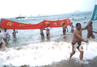圖:青島民眾歡慶申奧成功 2001年07月16日 11:54 ![]() 北京申辦2008年奧運(yùn)會(huì)的成功也給申辦協(xié)作伙伴城市青島帶來商機(jī)。圖為青島啤酒廠職員休,假日在沙灘海浪中歡慶勝利。中新社記者 鄭萍萍 攝