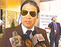 香港奧委會會長霍震霆七月十六日在國際奧委會第一一二次會議上獲選為國際奧委會委員。圖為霍震霆當選后接受記者采訪。