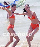 圖:中國(guó)模特海邊戲浪 2001年08月20日 15:21 ![]() 在美麗的青島海邊,兩名參加一場(chǎng)模特大賽的靚女身穿泳裝,舞動(dòng)著絲巾在海浪中盡情起舞。中新社記者 錢(qián)興強(qiáng) 攝