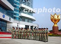 10月1日國慶節,香港警察在金紫荊廣場留影。中新社圖 任晨鳴 攝