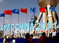 上海浦東十八日新豎起巨幅APEC標語和藍色大臺,休假的市民們紛紛來此感受盛會的歡樂。中新社記者 賈國榮 攝