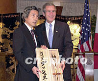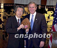 組圖:布什會(huì)見小泉純一郎 2001年10月20日 16:10 ![]() 10月20日,美國(guó)總統(tǒng)布什(右)在上海下榻的酒店會(huì)見日本首相小泉純一郎。圖為布什向小泉贈(zèng)送棒球手套。中新社圖 ![]() 10月20日,美國(guó)總統(tǒng)布什在下榻的酒店會(huì)見日本首相小泉純一郎。圖為小泉純一郎(左)向布什贈(zèng)送禮品。中新社圖