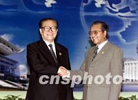 10月20日,中國國家主席江澤民在上海國際會議中心迎接馬來西亞總理馬哈蒂爾。中新社圖