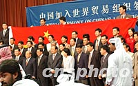 北京時間12日中國代表團成員在多哈展示中國國旗,慶祝中國入世。中新社記者 錢興強 攝