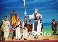 圖文:《射雕英雄傳》搬上京劇舞臺(tái)亮相南京 2001年12月12日 08:56 ![]() 武漢市京劇團(tuán)根據(jù)金庸的武俠小說(shuō)《射雕英雄傳》改編而成的同名京劇,十二月十日晚在南京大行宮會(huì)堂成功上演,成為第三屆中國(guó)京劇節(jié)唯一的一臺(tái)武俠劇。原著中描寫(xiě)高深莫測(cè)的武功借助京劇中的“出手”及現(xiàn)代特技,得到了較好表現(xiàn)。中新社圖 劉小楚 攝