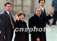 美國總統布什與夫人二十一日上午抵達北京首都國際機場,開始為期兩天的工作訪問。中新社圖 毛建軍 攝