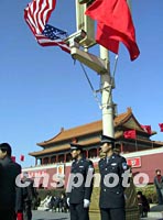 圖:五星紅旗與星條旗飄揚(yáng)在天安門前 2002年02月21日 16:11 ![]() 美國(guó)總統(tǒng)布什二月二十一日來華訪問,兩國(guó)國(guó)旗同時(shí)在天安門前飄揚(yáng)。中新社圖 杜洋 攝