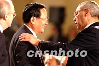 圖:唐家璇外長與鮑威爾交談 2002年02月21日 16:12 ![]() 中國外交部長唐家璇二十一日在北京與隨布什總統訪華的美國國務卿鮑威爾交談。中新社記者 賈國榮 攝