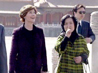 美國總統(tǒng)布什的夫人勞拉二十一日在中方人員陪同下興致勃勃地游覽故宮。