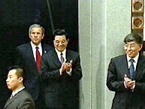 圖:胡錦濤陪同布什總統進入清華會場