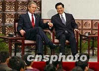 ![]() 中國國家副主席胡錦濤二十二日在北京清華大學聆聽訪華的美國總統布什演講。中新社記者 賈國榮 攝