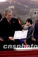 美國總統布什二十二日登上北京八達嶺長城后,獲得登城證書。中新社記者 毛建軍 攝