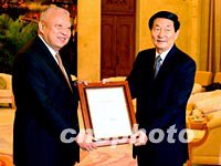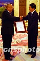 ![]() 中國總理朱镕基七日在北京人民大會堂香港廳,向董建華先生頒發連任香港特別行政區第二任行政長官的任命書。中新社記者 賈國榮 攝