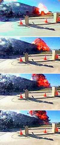 組圖:美國媒體公布飛機(jī)撞擊五角大樓瞬間照片 2002年03月08日 09:43 ![]() 五角大樓北面的監(jiān)視鏡頭拍攝的撞擊場面 中新網(wǎng)北京3月8日消息:美國傳媒公開一組去年“九·一一”恐怖襲擊事件中,國防部所在的五角大樓遭被劫持客機(jī)撞擊瞬間的照片。 據(jù)美聯(lián)社報(bào)道,這組照片共有五幅,是由懸掛在五角大樓北面的一個(gè)監(jiān)視鏡頭拍攝的。從照片中看,五角大樓北側(cè)遭飛機(jī)撞擊時(shí),從地面騰起一團(tuán)火焰,并冒出滾滾濃煙。