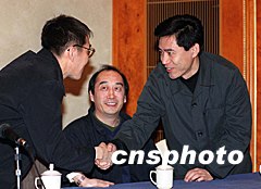 ![]() 二十集電視連續劇《公安局長》四月中旬即將開拍,該劇由田迪執導。圖為著名作家海巖(左)向男主角陳寶國(右)祝賀。該劇由公安部、中國新聞社、四川有線電視臺以及誠成影聯影視策劃聯合攝制,將于今年秋季播出。中新社記者 張宇 攝