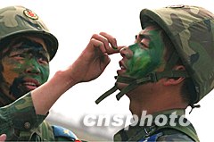 ![]() 解放軍空降兵某偵察兵部隊,四月在野外空降演練時,官兵們根據(jù)地貌互相在臉部涂抹迷彩進(jìn)行偽裝。中新社記者 王麗南 攝