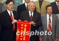 董建華會(huì)見臺(tái)灣"中國(guó)統(tǒng)一聯(lián)盟一國(guó)兩制參訪團(tuán)" 2002年04月11日 08:38 ![]() 香港特區(qū)行政長(zhǎng)官董建華,4月10日在香港禮賓府會(huì)見臺(tái)灣中國(guó)統(tǒng)一聯(lián)盟“一國(guó)兩制參訪團(tuán)”,團(tuán)長(zhǎng)王津平(左一)向董建華贈(zèng)送錦旗。中新社記者 任晨鳴 攝