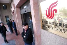 中國國際航空公司辦公室入口的保安人員。法新社圖