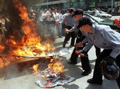 圖:韓國民間團體集會抗議日本首相靖國參拜 2002年04月22日 17:16 韓國在日本戰爭中的受害者,強烈抗議日本首相小泉純一郎參拜靖國神社。圖為在漢城韓國警察試圖熄滅抗議者燃燒的日本旗幟。法新圖