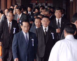 繼小泉后日本88名國會議員集體參拜靖國神社(圖) 2002年04月23日 10:26 ![]() 日本國會議員集體參拜 中右為自民黨干事長山崎拓 中新網北京4月23日消息:由日本保守派議員組成的“大家都來參拜靖國神社國會議員會”的成員今天上午集體參拜了靖國神社。 據共同社報道,自民黨干事長山崎拓、保守黨干事長二階俊博和民主黨的小林憲司等88名參眾兩院議員,91名國會議員的代理人以及國家公安委員長村井仁參加了靖國參拜。 日本首相小泉純一郎21日上午突然參拜了靖國神社,引起中國和韓國政府的強烈不滿和抗議。 位于東京九段北的靖國神社內供奉著日本明治維新以來歷次對外戰爭中246萬多戰死者的牌位,其中包括東條英機等甲級戰犯。
