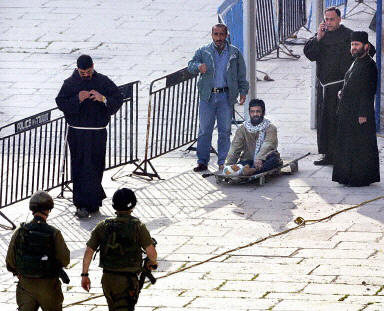 詳訊:39名巴勒斯坦武裝人員今天離開圣誕教堂 2002年05月10日 14:10 圖為受腿傷的武裝人員。法新圖 中新網北京5月10日消息:伯利恒當地時間5月10日上午(北京時間5月10日中午),被困伯利恒圣誕教堂長達五周之久的39名巴勒斯坦武裝人員今天被幾輛公共汽車帶走。根據歐盟調解的協議,其中13名以色列方面強烈通緝的武裝人員將被一架英國軍用飛機帶往塞浦路斯,然后轉往幾個歐洲國家。另外26名武裝人員將被帶往加沙地區。 據以色列軍方的一位發言人稱,載有13名巴方武裝人員的公共汽車已經抵達教堂附近的一個軍事基地,其中一名武裝人員將在那里接受腿傷治療,然后他們將被帶往特拉維夫附近的一個機場。 另據報道,英國一架軍用飛機已經離開塞浦路斯基地,前往以色列引渡13名巴勒斯坦武裝人員,這些武裝人員曾在伯利恒的圣殿教堂與以色列軍方對峙交火。 這架軍用飛機的型號是綽號“大力神”的C-130型運輸機,塞浦路斯官員表示,“有關方面通知我們這架飛機是前往以色列引渡巴勒斯坦人員的。” 塞浦路斯曾于本周四與歐盟官員進行過協商,并決定暫時收容這13名巴方武裝人員。官員們預計這些武裝人員將在塞浦路斯停留至下周一,然后由歐盟外長會議決定他們應當被引渡到何地。被引渡的13名武裝人員中包括伯利恒的巴勒斯坦情報部門的首腦阿卜杜拉-道德(Abdullah Daoud)。 根據以巴雙方達成的和解協議,在這13名巴方的武裝人員被引渡到歐盟國家以后,另外26名巴方人員將被帶到加沙地區,以方還將釋放大約85名平民。(春風)