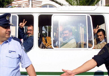 圖:12名巴武裝人員離開(kāi)塞浦路斯前往歐盟6國(guó) 2002年05月22日 15:14 12名滯留在塞浦路斯的巴勒斯坦武裝人員22日動(dòng)身前往機(jī)場(chǎng),并將乘坐兩架飛機(jī)分別前往6個(gè)歐盟國(guó)家。法新供中新