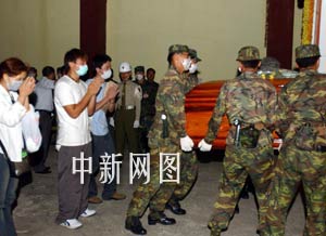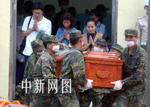 組圖:馬公空軍基地成華航遇難者身份辨認(rèn)中心 2002年05月26日 22:56 ![]() 部分失事華航客機遇難乘客遺體從澎湖空運回臺灣島。5月26日傍晚,部分已經(jīng)確認(rèn)身份的失事華航客機遇難乘客尸體被巨型C130運輸機運回臺灣島。中新社傳真任晨鳴攝 ![]() 多數(shù)華航遇難乘客家屬選擇土葬。5月26日,臺灣澎湖馬公空軍基地成為搜索到的遇難乘客尸體辨認(rèn)中心。中新社傳真任晨鳴攝 ![]() 擺放在臺灣澎湖馬公空軍基地中的盛殮遇難者遺體的棺材。5月26日,臺灣澎湖馬公空軍基地中的遇難乘客尸體辨認(rèn)中心排列了眾多棺材。中新社傳真任晨鳴攝 ![]() 華航遇難乘客家屬送親人上靈車。5月26日下午,確認(rèn)了身份的華航遇難乘客尸體被家屬送上靈車。中新社傳真任晨鳴攝 ![]() 臺灣澎湖馬公空軍基地成為華航遇難乘客身份辨認(rèn)中心。一向門禁森嚴(yán)的臺灣澎湖馬公空軍基地,5月26日人流不息,成為華航遇難乘客的身份辨認(rèn)中心。中新社傳真任晨鳴攝 鄭重聲明:關(guān)于臺灣華航飛機失事的新聞信息,系中新網(wǎng)特稿,未經(jīng)書面授權(quán),不得采用。