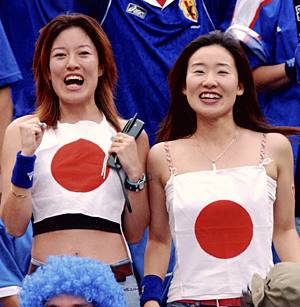 觀看日本與比利時隊比賽的日本女球迷身著性感裝為日本隊加油。共同社圖