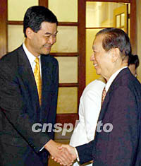 圖:慶祝晚宴上錢其琛與梁振英握手 2002年06月30日 22:14 ![]() 六月三十日,國務院副總理錢其琛在香港出席特區政府成立五周年慶祝晚宴時與行政會議召集人梁振英握手。潘索菲 攝